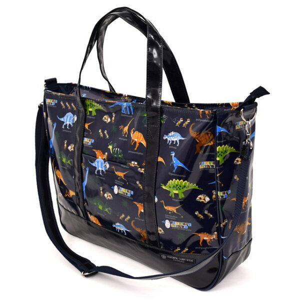 商品名レッスンバッグ マチ付きファスナー 発見!探検!恐竜大陸(ネイビー)商品の特長1.型崩れしにくいマチ付きラミネートバッグマチをエナメルパイピングで補強してあるので耐久性も抜群。